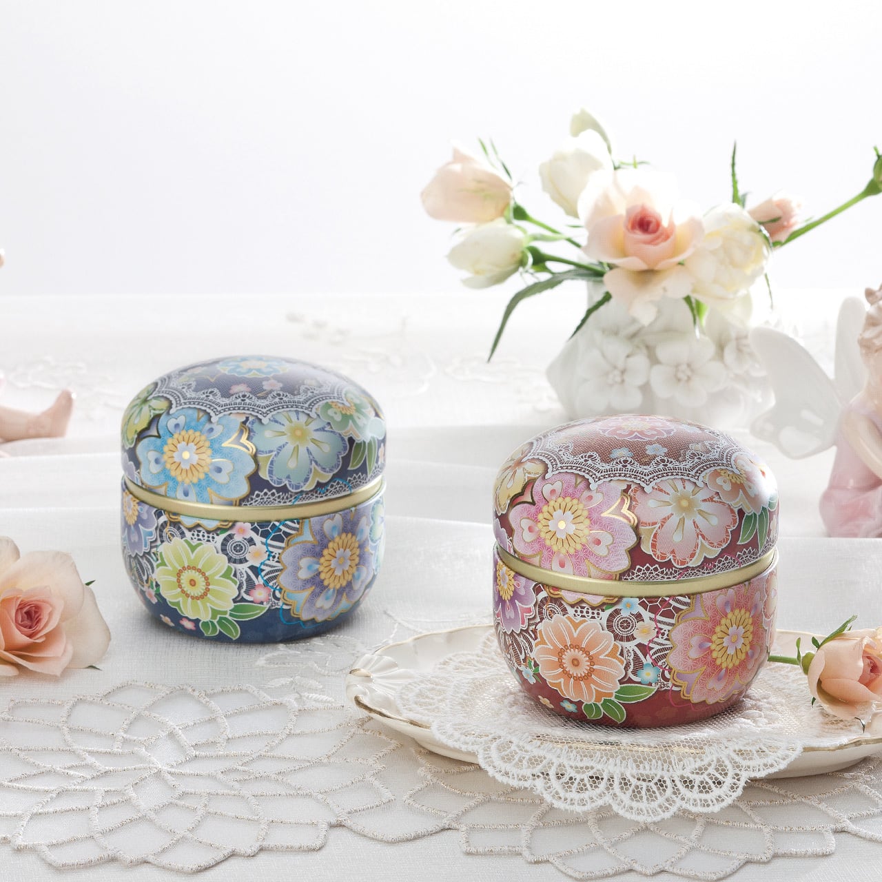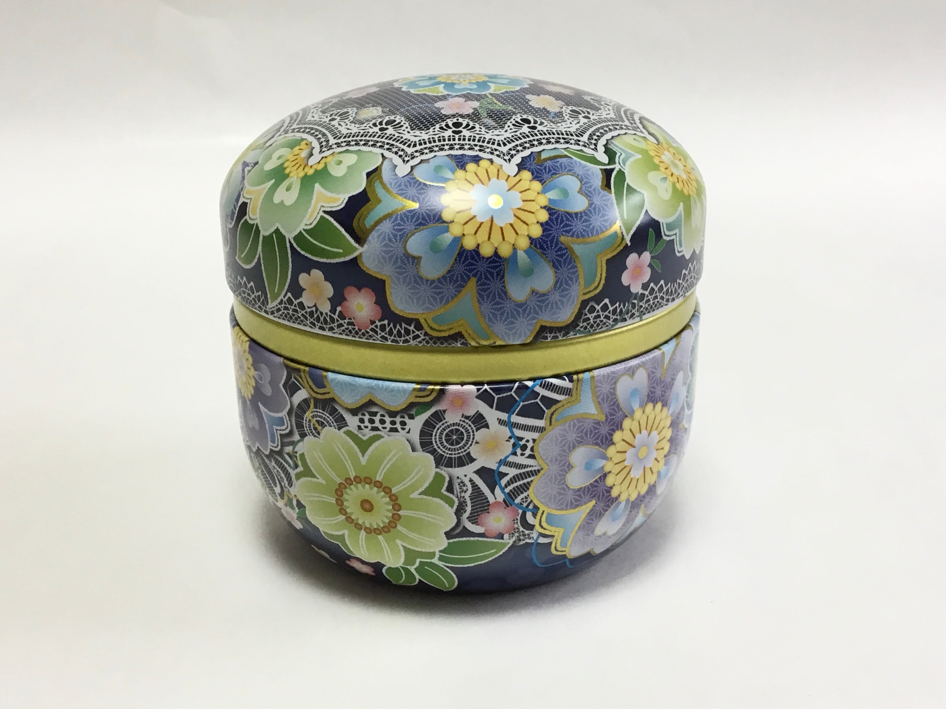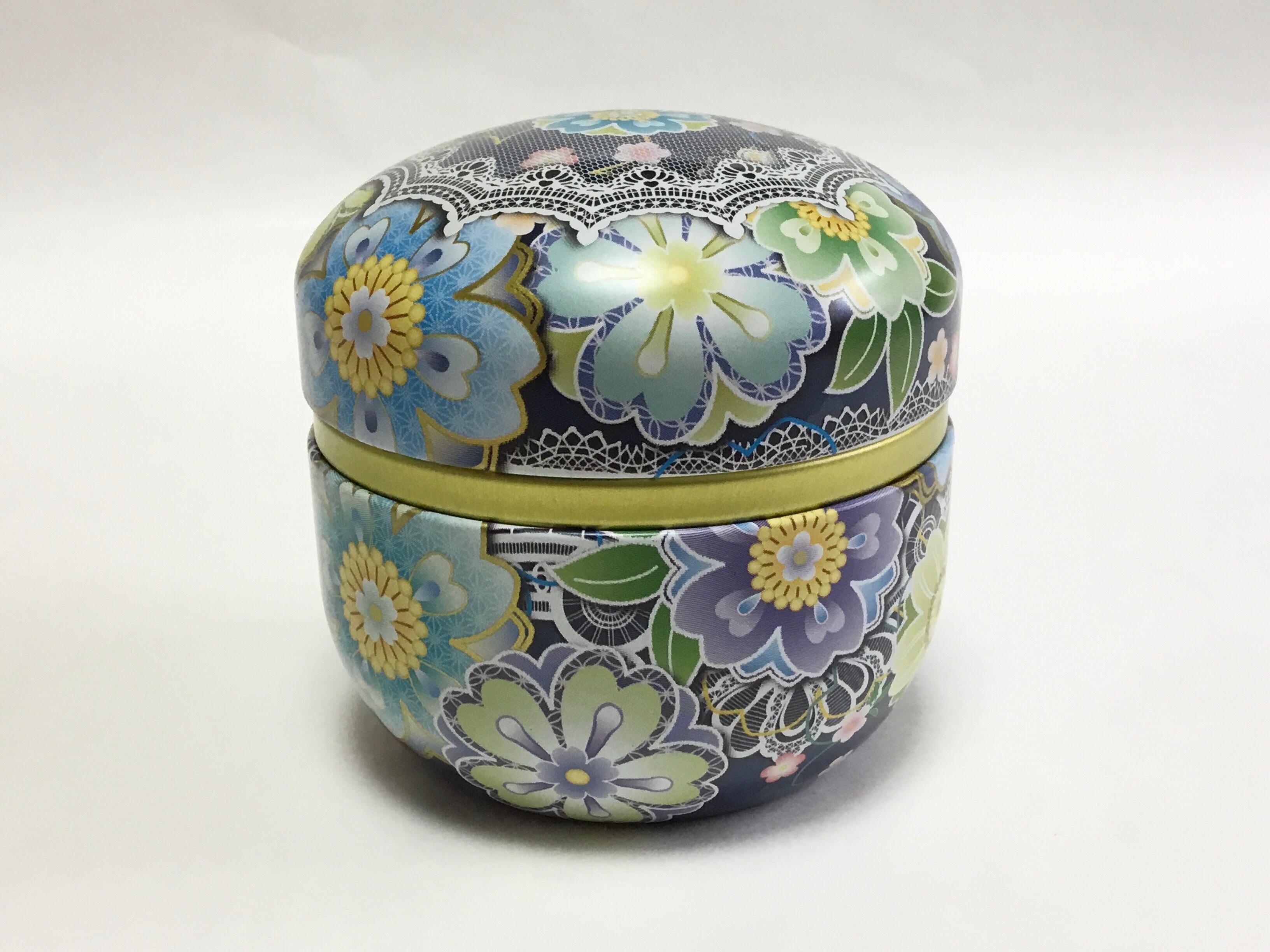 中世ヨーロッパのレースで編んだかぶり物と花と小花で可愛らしさと華やかさを表現されたデザイン! 洋風なレース柄と和風の花柄がとても華やかでかわいらしいお茶筒です。 中蓋もついており、お茶入れの缶としてはもちろん、 小物や飴などのちょっとしたお菓子を入れても可愛い缶です。 サイズ:高さ約8.5センチ、径約8センチ ※煎茶が100g入ります。